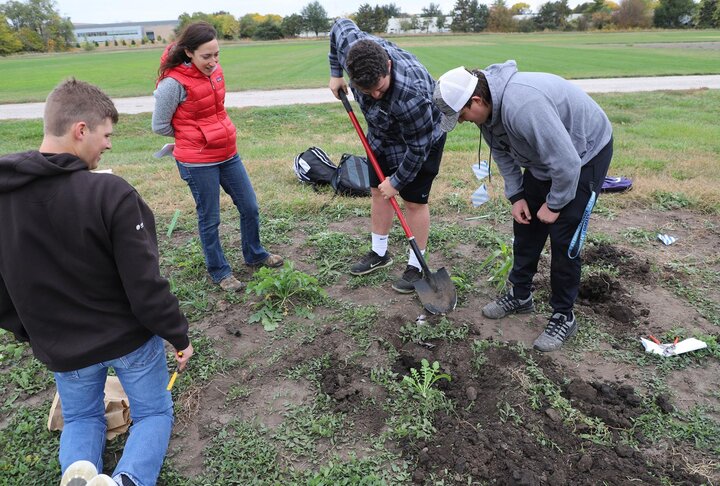 Assistant Professor Andrea Basche (second from left) watches as Chad Niemeier (from left), Brady Keller and Riley Huettner excavate what is left of white cotton underwear buried beneath their cover crop plots for roughly six weeks. The students were able to observe decomposition of the cotton over time.